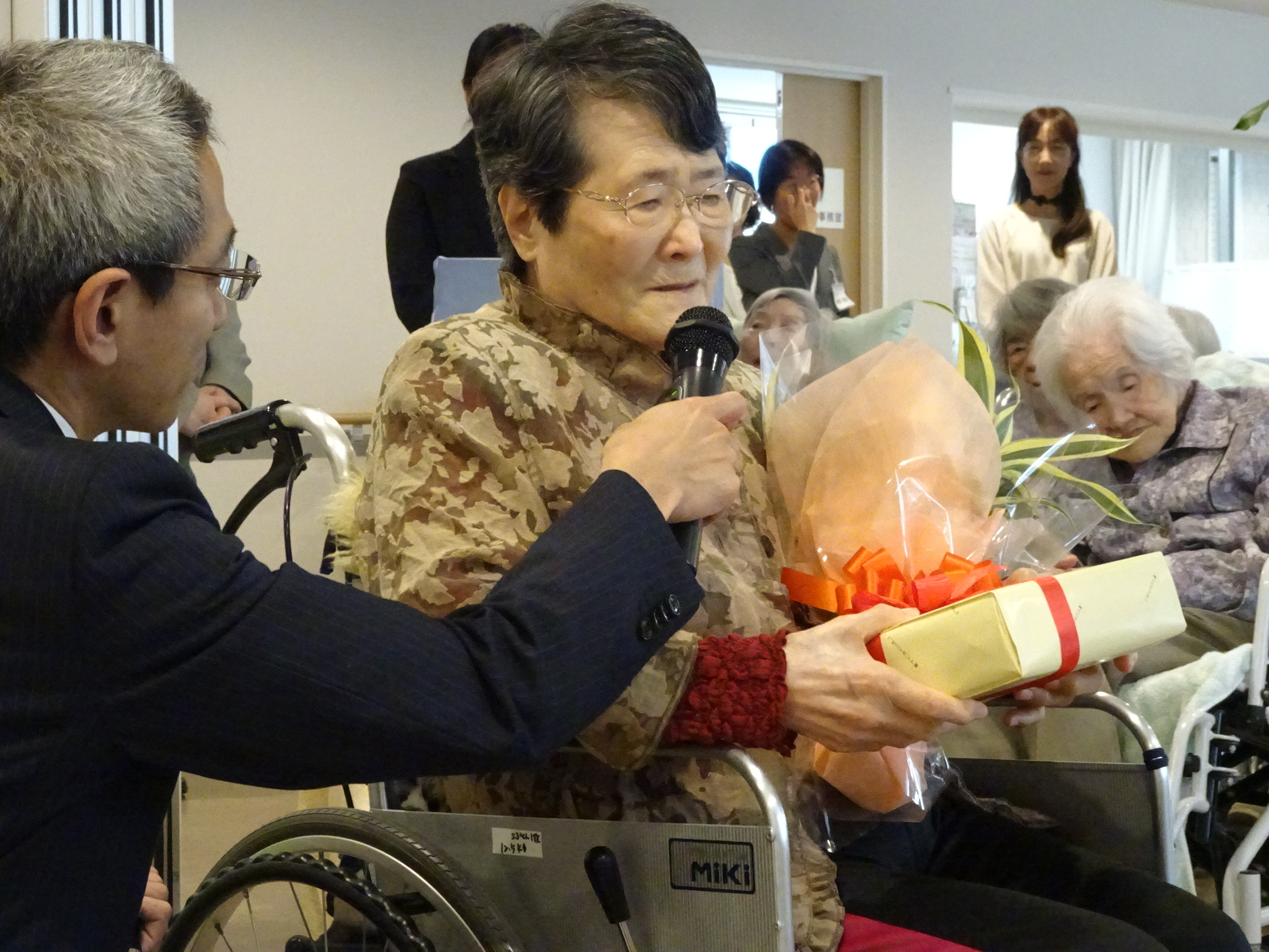 また、米寿を迎える2名のご入居者様には、花束とあったかーい靴下をプレゼントいたしました。